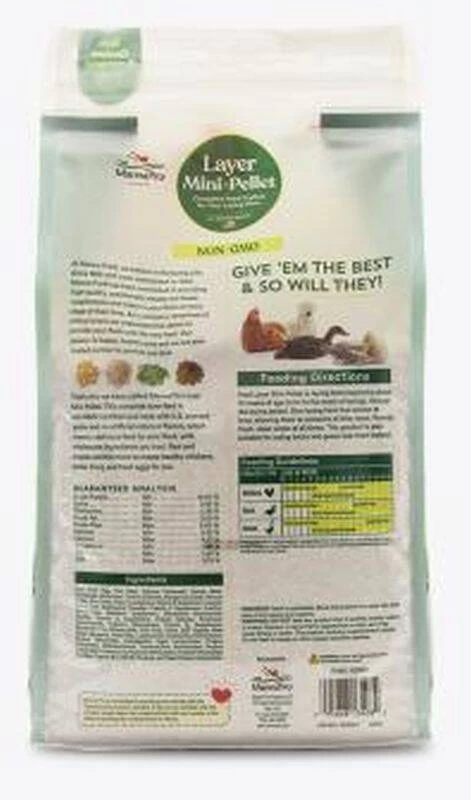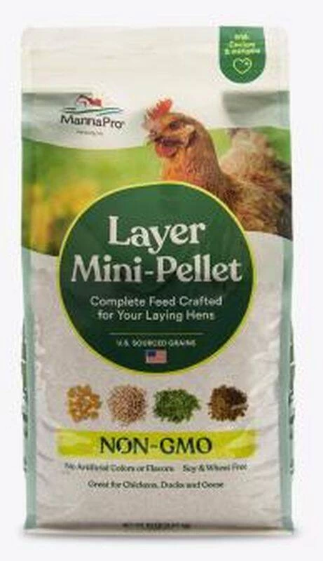 Manna Pro®Non-GMO Layer Mini-Pellets isa complete layer feed and non-GMO certified. Made with U.S.-sourced grains and no artificial colors or flavors, its a delicious feed for your flock with wholesome ingredients you can trust. Real nutrition from us means healthy chickens, better living and fresh eggs for you. Its perfect for mixed flocks.