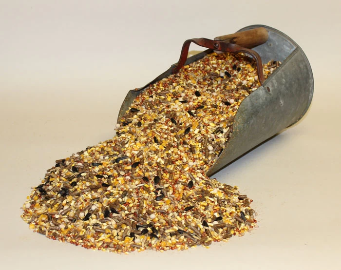 | Ingredients | Popcorn, Soybean Meal, Cleaned Steel-Cut Corn Chops, Recleaned Whole Milo, Recleaned Whole Wheat, Recleaned Whole Oats, Canadian Trapper Peas, Sunflower Seed, Wheat Middlings, Dehydrated Alfalfa Meal, Fish Meal, Calcium Carbonate, Soybean Oil, Hominy, Oat Groats, Dried Whey, Dicalcium Phosphate, Salt, Iron Oxide, Vitamin A Supplement, Vitamin E Supplement, Vitamin D3 Supplement, Choline Chloride, Niacin, Riboflavin, Calcium Pantothenate, Pyridoxine Hydrochloride, Thiamine Monnitrate, Vitamin B12 Supplement, Folic Acid, Biotin, Ferrous Carbonate, Ferrous Sulfate, Manganous Oxide, Copper Oxide, Copper Sulfate, Zinc Oxide, Cobalt Carbonate, Calcium Iodate, Sulfur, Sodium Selenite. |