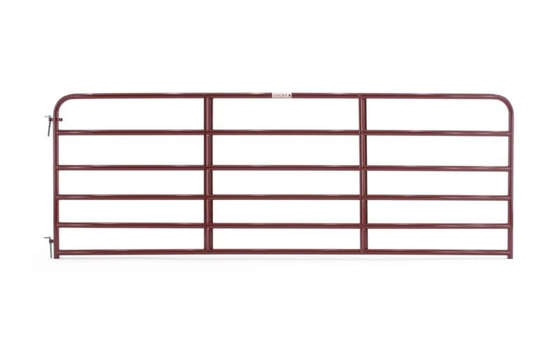The perfect gate between pastures and entries, our 1-3/4 in rounded high-tensile strength tubing with superior continuous-welded saddle joints has the quality that has made Tarter the leader in farm gate products. 50 in high with vertical Z Braces, this gate features a superior E-Coat finish to ensure longer life in the field. All gates are available in lengths from 4 ft to 20 ft and come complete with hinges, hinge pins, and 22 in snap chain. The 6-bar is available in green, red, blue, gray, walnut brown or black and the 7-bar is available in red only.