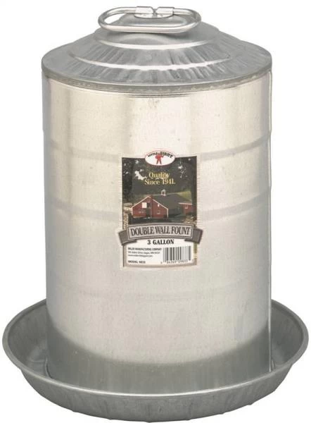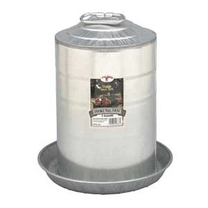 A heavy-duty standalone waterer for chickens, turkeys, and other poultry. Double-wall construction features an inner tube with a strong arched handle for carrying the filled fount and an outer tube with its own handle for convenience. When the outer tube is inserted over the inner tube, a copper spring and neoprene seal create a vacuum to maintain a constant water level in the drinking pan. Features a locking pin to hold the outer tube in place. Sloped top prevents roosting. Constructed of heavy-gauge galvanized steel with rolled edges for safety. Seams are constructed and tested to prevent leaks. A key advantage of metal founts is the ability to use the fount in winter with a heater base such as the Little Giant electric water heater base (item no. Hb125, sold separately). This is not a hanging waterer, it must be placed on the ground or floor. 12.25-inches in diameter by 15-inches high.