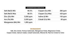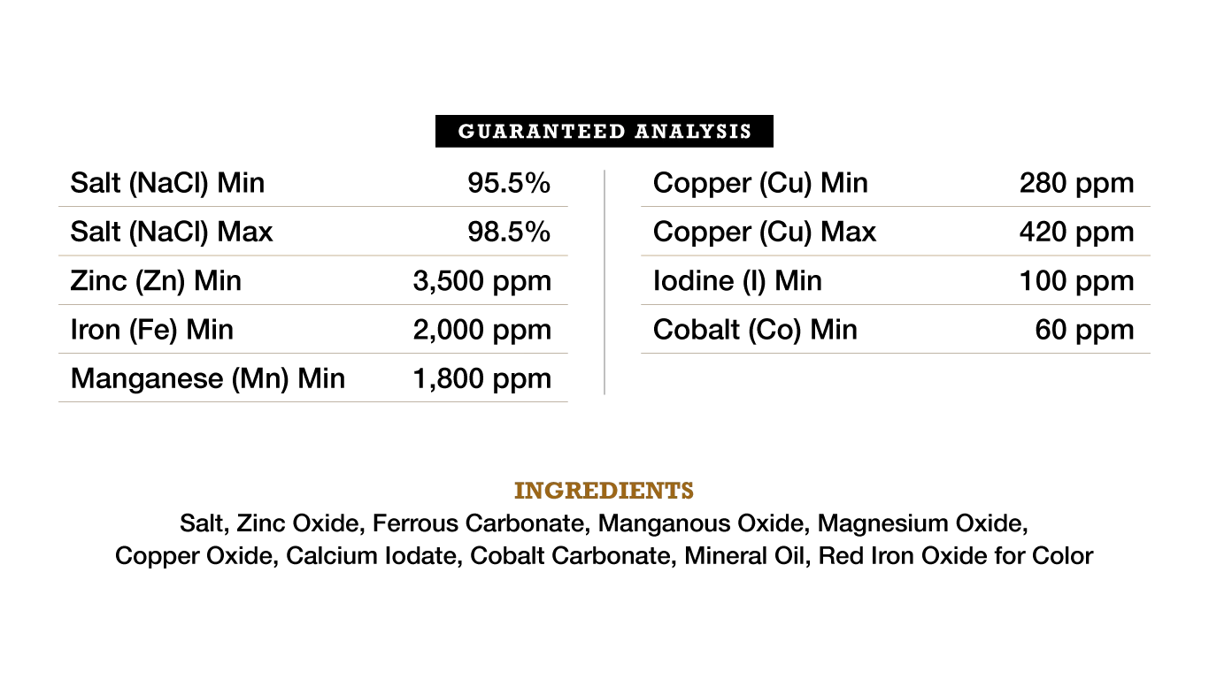 | Ingredients | Salt, Zinc Oxide, Ferrous Carbonate, Manganous Oxide, Magnesium Oxide, Copper Oxide, Calcium Iodate, Cobalt Carbonate, Mineral Oil, Red Iron Oxide for Color |