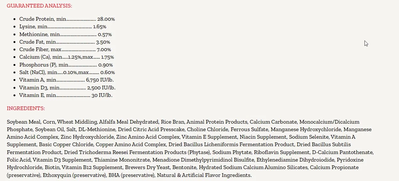 | Ingredients | Soybean Meal, Corn, Wheat Middling, Alfalfa Meal Dehydrated, Rice Bran, Animal Protein Products, Calcium Carbonate, Monocalcium/Dicalcium Phosphate, Soybean Oil, Salt, DL-Methionine, Dried Citric Acid Presscake, Choline Chloride, Ferrous Sulfate, Manganese Hydroxychloride, Manganese Amino Acid Complex, Zinc Hydroxychloride, Zinc Amino Acid Complex, Vitamin E Supplement, Niacin Supplement, Sodium Selenite, Vitamin A Supplement, Basic Copper Chloride, Copper Amino Acid Complex, Dried Bacillus Licheniformis Fermentation Product, Dried Bacillus Subtilis Fermentation Product, Dried Trichoderma Reesei Fermentation Products (Phytase), Sodium Phytate, Riboflavin Supplement, D-Calcium Pantothenate, Folic Acid, Vitamin D3 Supplement, Thiamine Mononitrate, Menadione Dimethylpyrimidinol Bisulfite, Ethylenediamine Dihydroiodide, Pyridoxine Hydrochloride, Biotin, Vitamin B12 Supplement, Brewers Dry Yeast, Bentonite, Hydrated Sodium Calcium Alumino Silicates, Calcium Propionate (preservative), Ethoxyquin (preservative), BHA (preservative), Natural & Artificial Flavor Ingredients. |