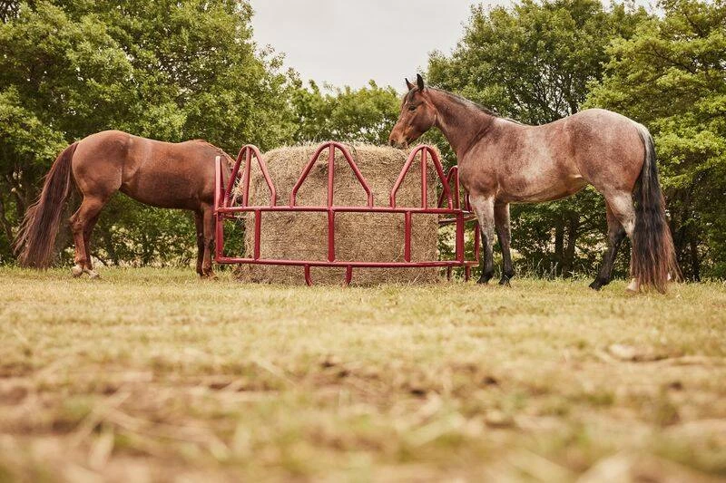 Tarter’s Equine Pro Hay Feeder safely serves up fresh, clean hay. It’s 8’ in diameter so it will easily accommodate large, round hay bales. Rounded dividers with no sharp edges ensure equine safety and give horses enough space to comfortably eat. A corrosion-resistant finish means it will last a long time out in the elements. The design of the loop legs will prevent the feeder from sinking into the ground. Not recommended for cattle.