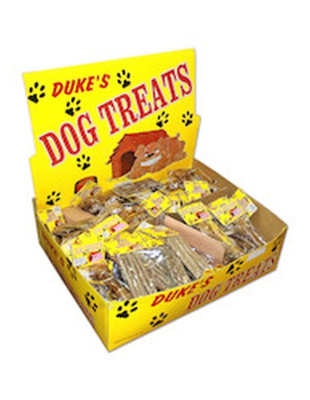 Dog chew treats are made of rawhide and come in assorted styles. Styles include: bone, beef jerky, twisted sticks and two pack bones. Each toy comes packaged in a poly bag and header card with upc.