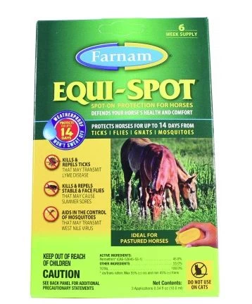Insects are more than annoying; they can also transmit serious diseases. You can’t always be there to apply fly and insect protection, but Equi-Spot Spot-On Protection for Horses does the job for you. Applied once every two weeks, it provides long-lasting control against dangerous ticks that can spread Lyme disease and mosquitoes that may transmit West Nile Virus and Equine Encephalitis, as well as biting flies and gnats.
