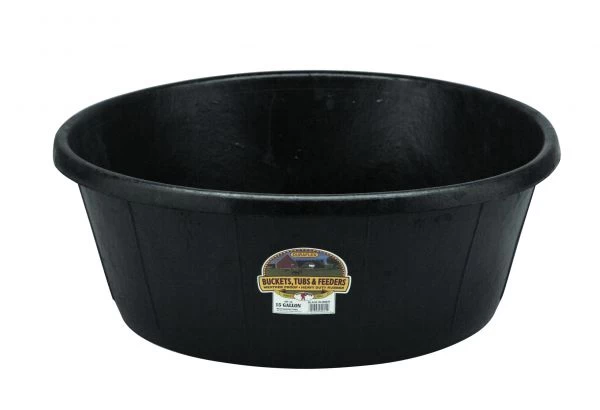Molded from the finest corded rubber on the market, nothing matches the pliability and strength of DuraFlex rubber. Crush-proof, crack-proof, and freeze-proof so you can use it outside year-round. A great all-purpose tub that holds up to rugged use and abuse. Rubber is naturally safe and soft for animals. Perfect for large feeding jobs; also works great for many other jobs around the farm, ranch, garden, and shop. 26 in diameter by 9.75 in high, holds 15 gallons.