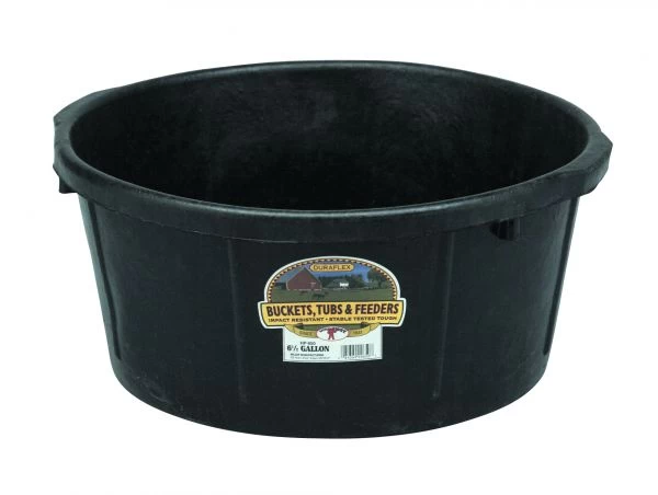 Molded from the finest corded rubber on the market, nothing matches the pliability and strength of DuraFlex rubber. Crush-proof, crack-proof, and freeze-proof so you can use it indoors or outdoors year-round. A great all-purpose tub that holds up to rugged use and abuse, with molded-in handles for easy carrying. Rubber is naturally safe and soft for animals. Perfect for livestock feeding and watering, and many other jobs around the farm, ranch, garden, and shop. 18 in diameter by 8 in high, holds 6.5 gallons.